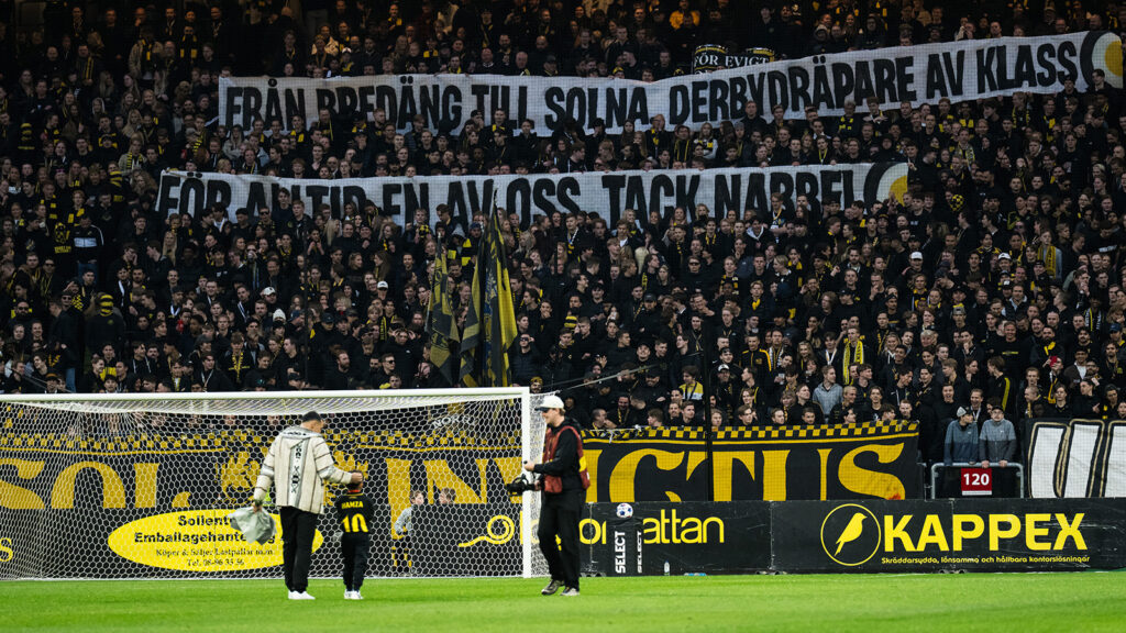 Supportrarna visade även en banderoll tillägnad 35-åringen där det stod: ”Frän Bredäng till Solna, derbydräpare av klass. För alltid en av oss, tack Nabbe!”