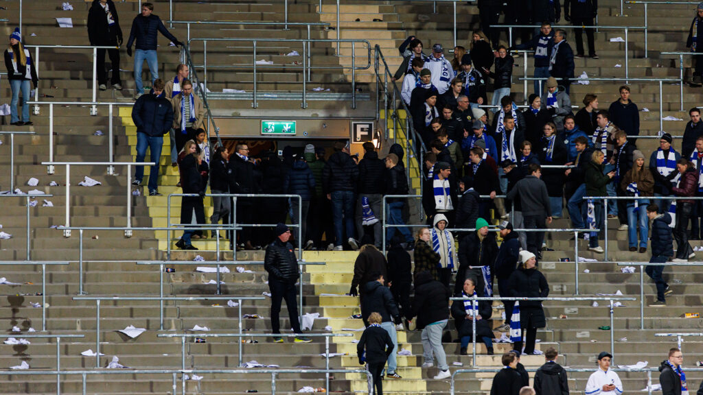 Efter längre avbrott och ett matchmöte togs beslutet att IFK Norrköpings hemmaståplats måste tömmas för att återuppta matchen.