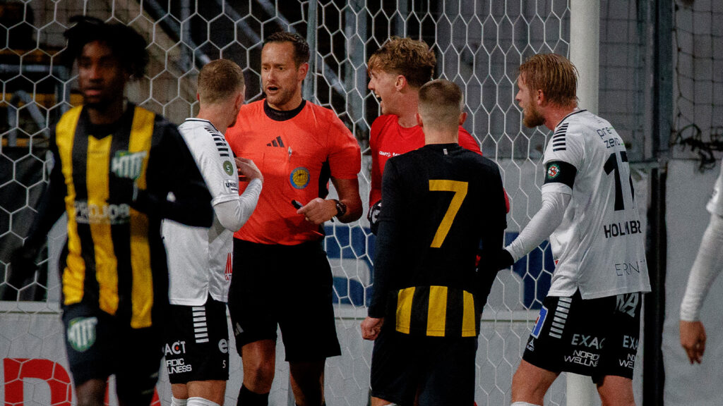 Domare Wolff valde då att tillkalla sig sina kollegor för att konferera om vilka beslut man skulle ta – i tre minuter. Därefter fick sex spelare syna det gula kortet och utbytte Wilson Lidberg Uhrström lämna planen till följd av en utvisning.