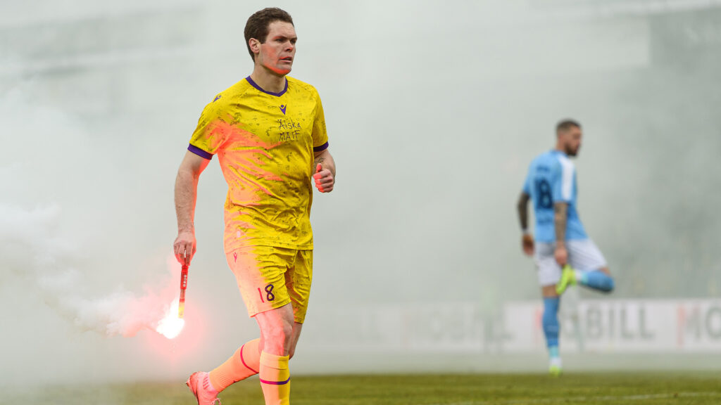 Det var efter Villiam Granaths 4–0 mål som topplocket gick för en klick tillresta MFF-supportar. Flera bengaler kastades in på planen mot de egna spelarna.