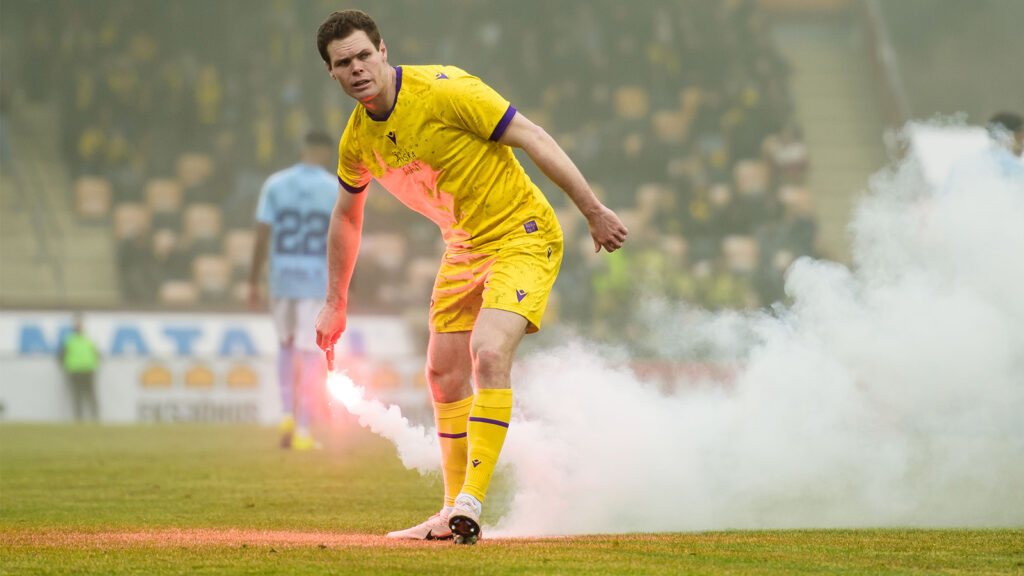 Jacob Bergström hjälpte själv till att rensa planen från de inkastade bengalerna.